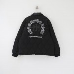 •Chrome Hear**(크*) 스타일의 십자가 장식 실버 버튼 재킷으로, 패널마다 퀼팅과 봉제 디테일을 살린 호리병무늬 디자인과 헤비한 공정의 장식이 특징입니다. 뒤쪽에는 가죽 소재의 십자가 장식과 정교한 대형 자수가 더해져 시각적 포인트를 주며, 가죽 컬러의 칼라 디테일로 전체적인 품격과 무게감을 높였습니다. 전체적으로 여유 있는 루즈핏으로 남녀 모두 멋스럽게 착용할 수 있는 유니섹스 아이템입니다. 색상은 블랙 단일 구성입니다.
